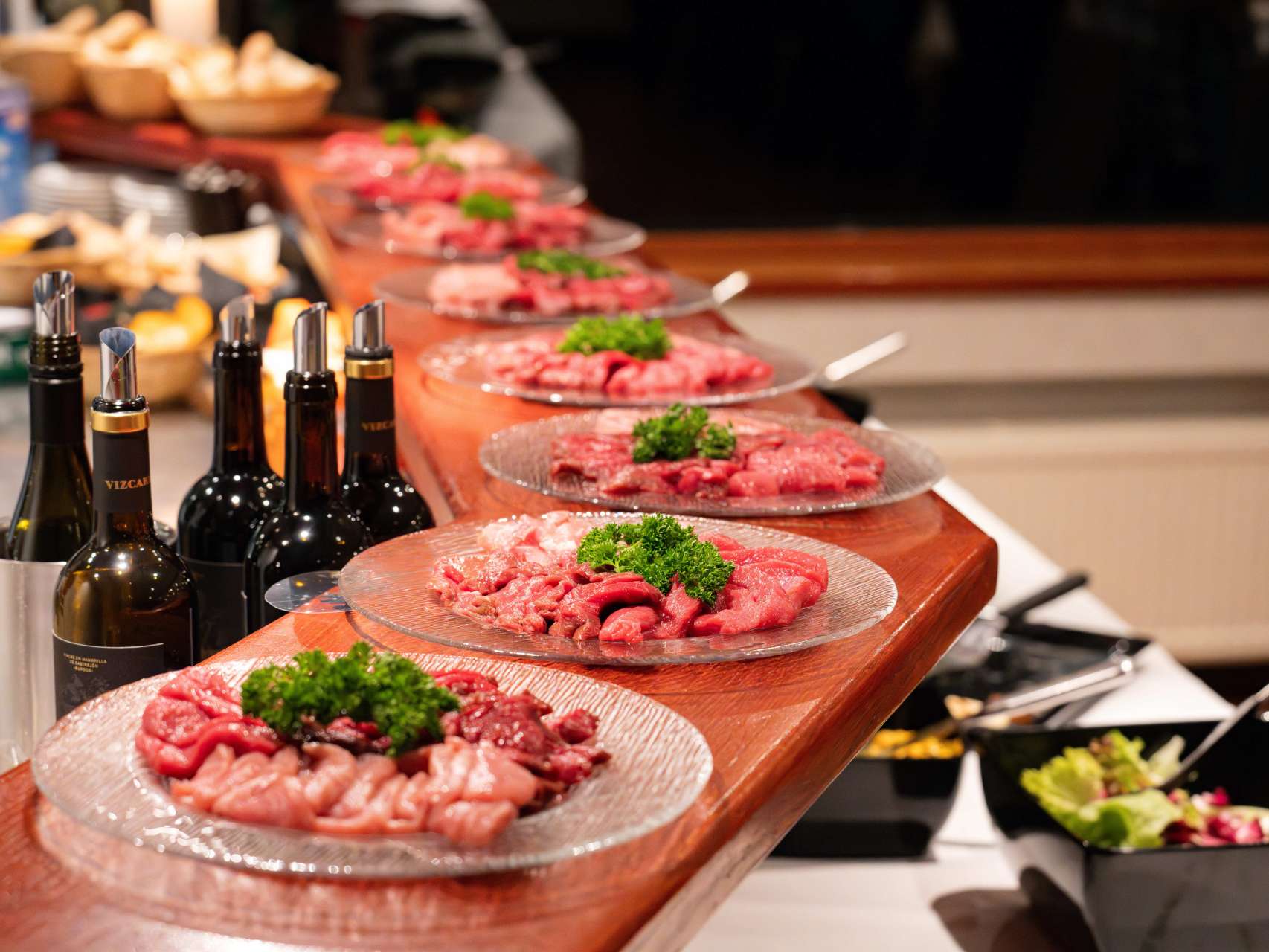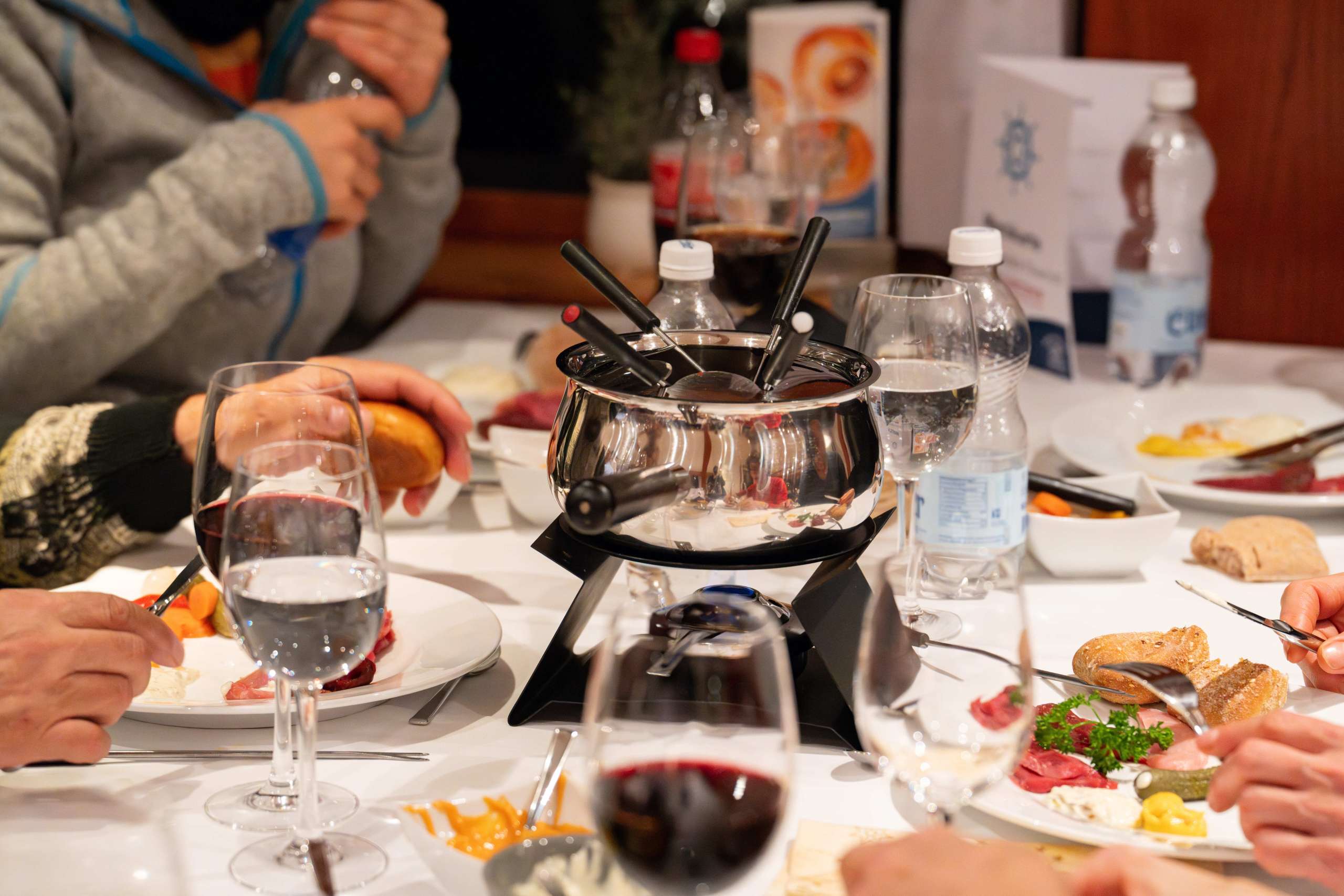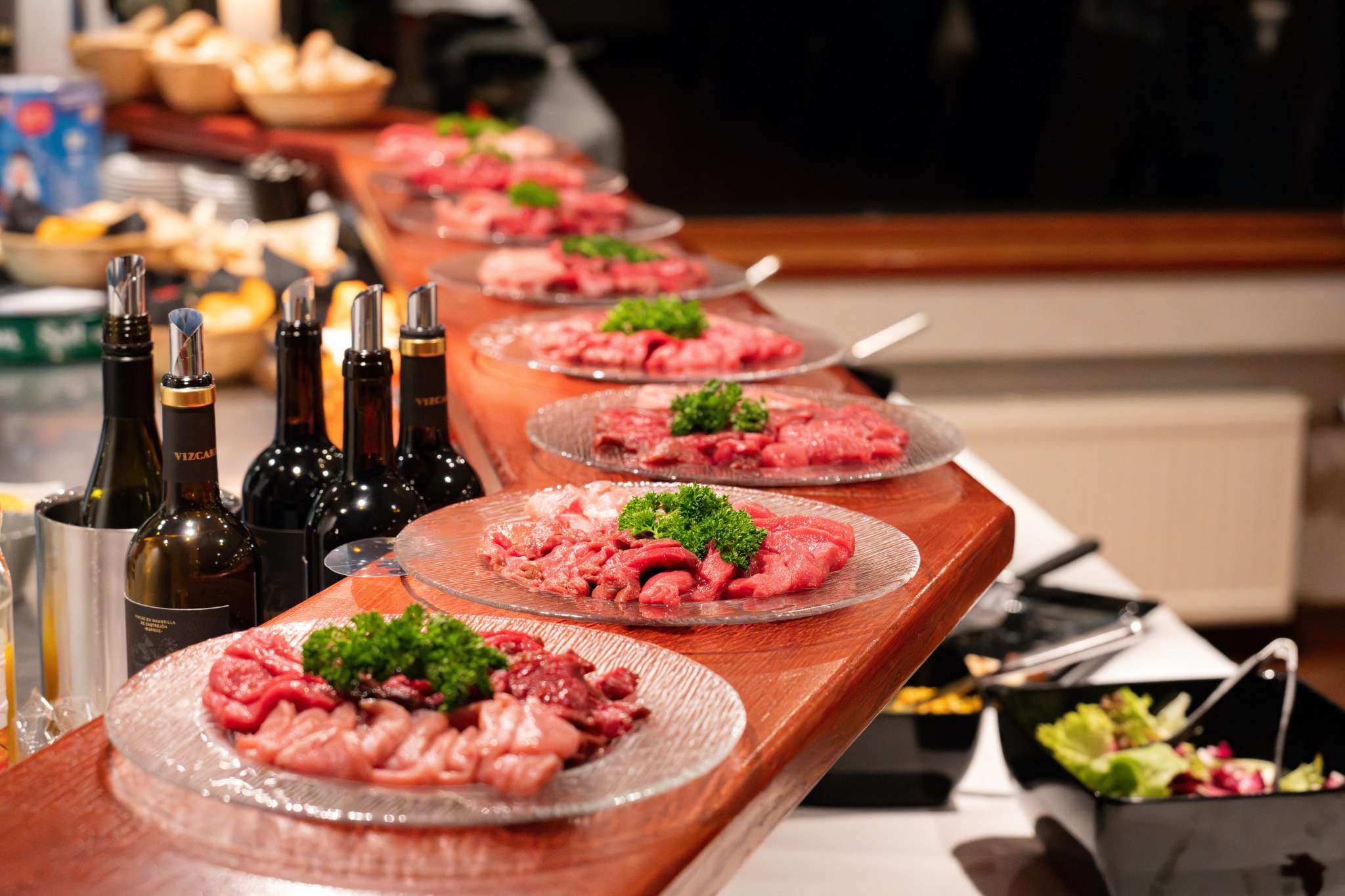 In geselliger Atmosphäre werden zarte Fleischstücke, feine Saucen und vielfältige Beilagen serviert – ein kulinarisches Erlebnis, das Wärme und Genuss perfekt verbindet.
