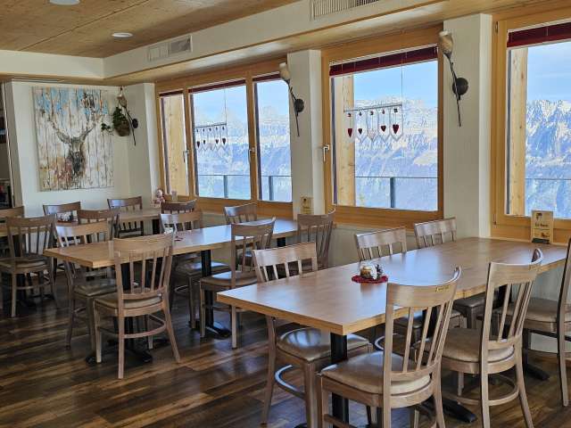 Im neuen und gemütlichen Restaurant mit gut bürgerlicher Küche und Panoramasicht finden bis zu 80 Personen Platz. Auf der gemütlichen Sonnenterrasse kann man den Ausblick geniessen. Für die kleinen Gäste gibt es einen Aussen-Spielplatz und ein Spielzimmer.