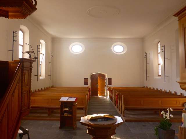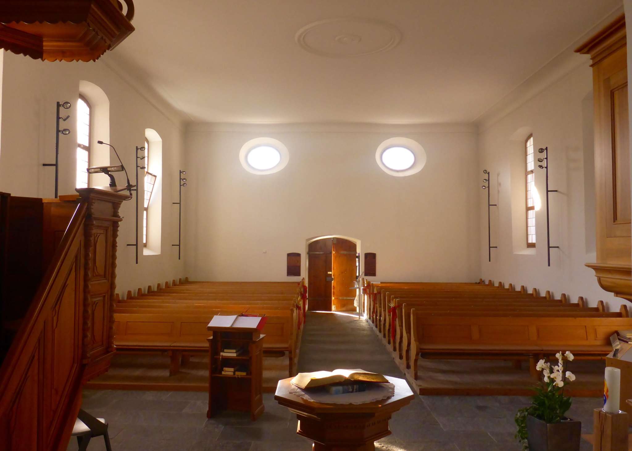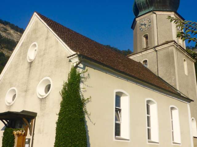 Die Evangelische Kirche in Fläsch beeindruckt mit ihrem ungewöhnlichen Grössenverhältnis von Turm und Kirchenschiff. Umfangreiche Secco-Malereien zieren die Innenwände und Gewölbe, freigelegt 1962/63. Fläsch war 1524 die erste reformierte Gemeinde in Graubünden.