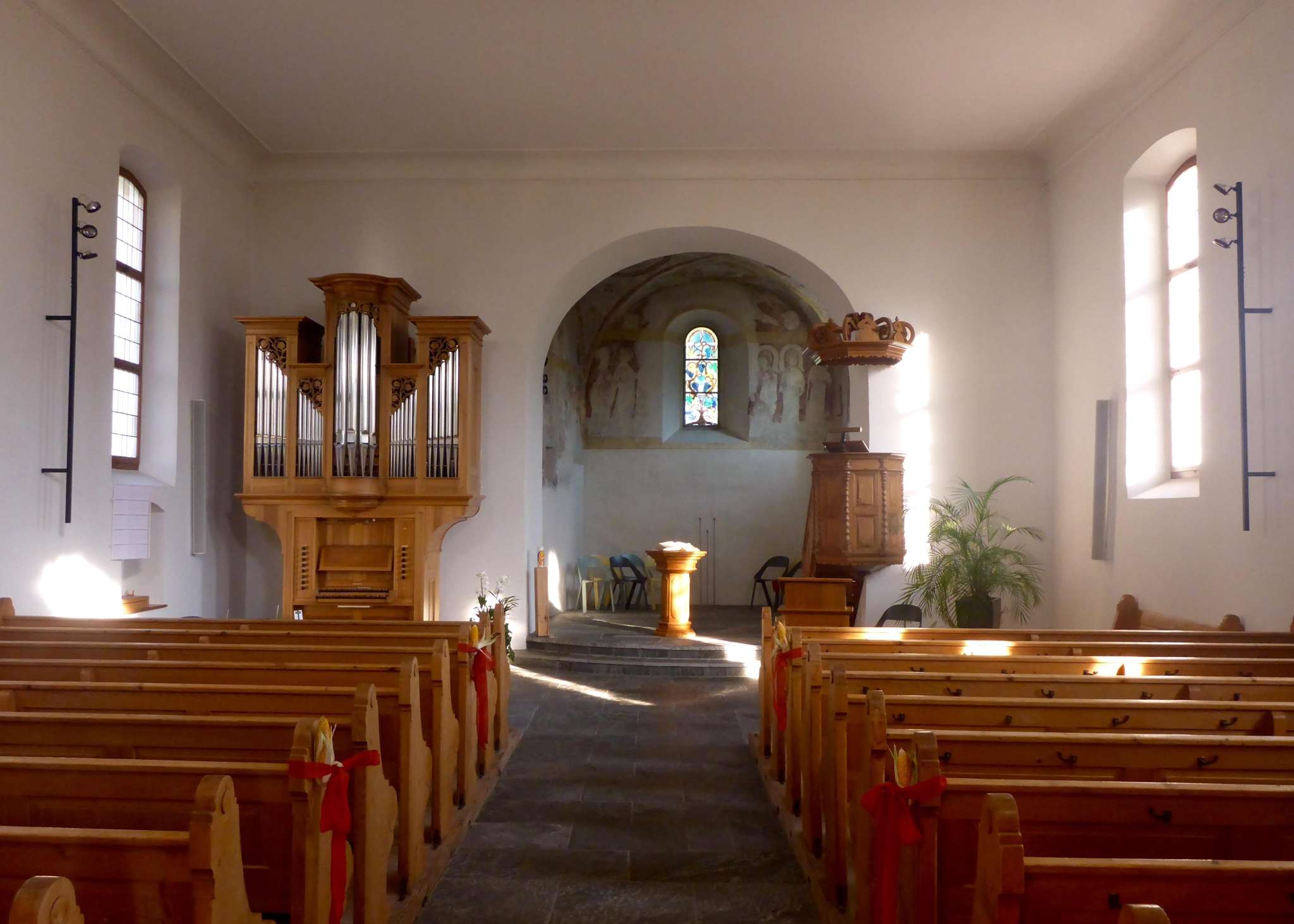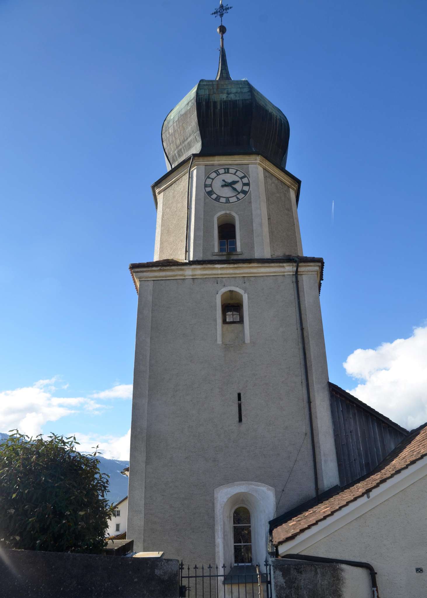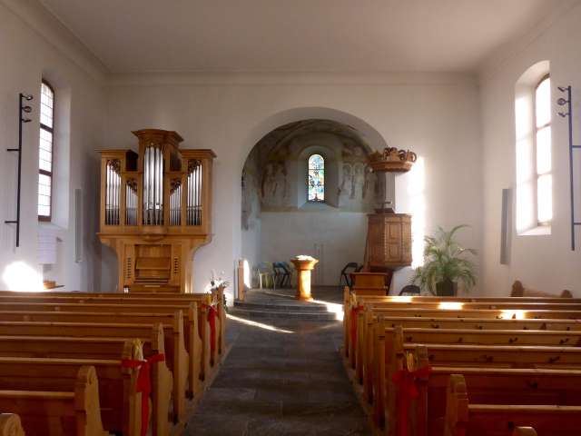 Das ungewohnte Grössenverhältnis von Turm und Kirchenschiff lassen die Kirche lieblich erscheinen, die in GR seltene Turmchoranlage erfordert die Dimension des Turmfusses. Das untere Turmgeschoss ist vier-, das obere achteckig. Umfangreiche Secco-Malereien zieren innere Wände und Gewölbe; Freilegung 1962/63. 1524 wird Fläsch die erste reformierte Gemeinde des Kantons Graubünden.