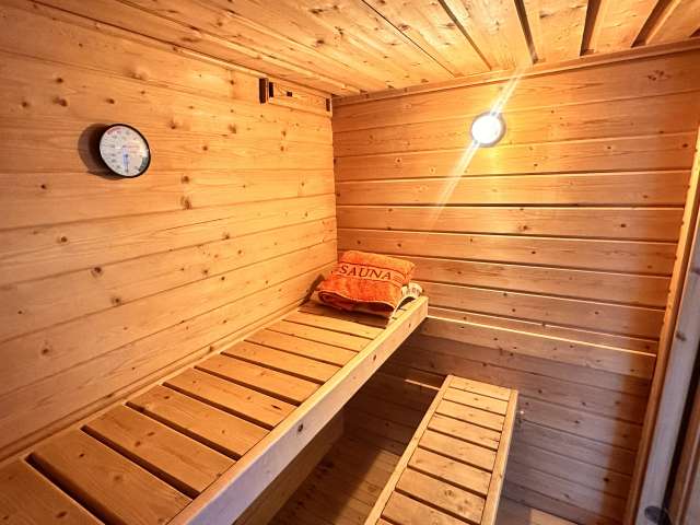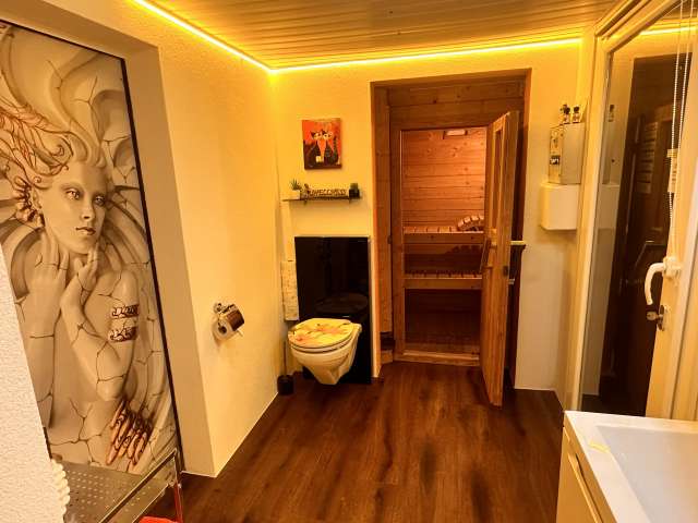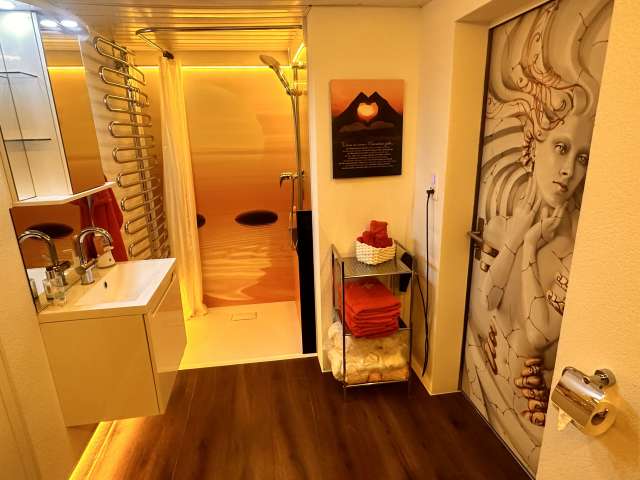 Dusche, WC, Lavabo und eigene Finnische Sauna.
