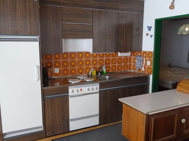 Komplette Küche mit grossem Kühlschrank, 3 Kochplatten, Backofen, Mikrowelle und genügend Schränken.