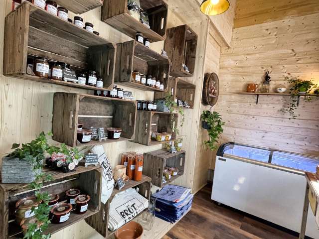 Im Selbstbedienungs-Hofladen finden Kunden 5 Tage die Woche ein ausgesuchtes, saisonales Angebot vom Hof. Gebäck wie Nuss- und Linzertorten, Frischfleisch (gefroren) und Trockenfleisch, Bienenhonig, Hof-Glace, Alpkäse u.v.m. – Wer Zeit hat, verweilt in der angegliederten Besenbeiz bei einem feinen, in Untervaz gerösteten Kaffee und einem Stück Küchen aus der Hofbäckerei.