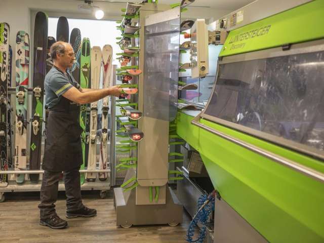 Die INTERSPORT Network Flumserberg Filiale Tannenheim bietet eine breite Auswahl an Mietmaterialien wie Ski, Snowboards und Schlitten. Eine zentrale Werkstatt für Ski- und Snowboard-Service befindet sich im zweiten Obergeschoss.
