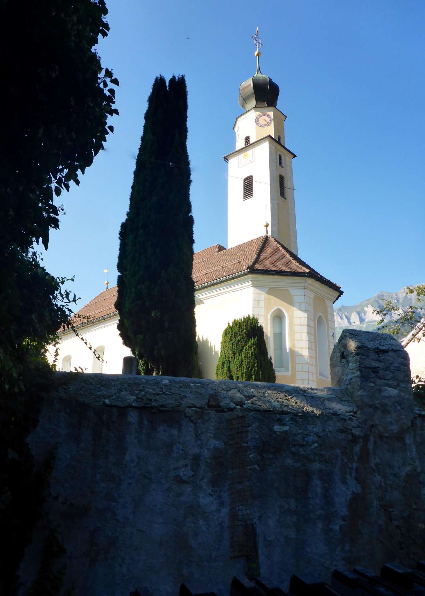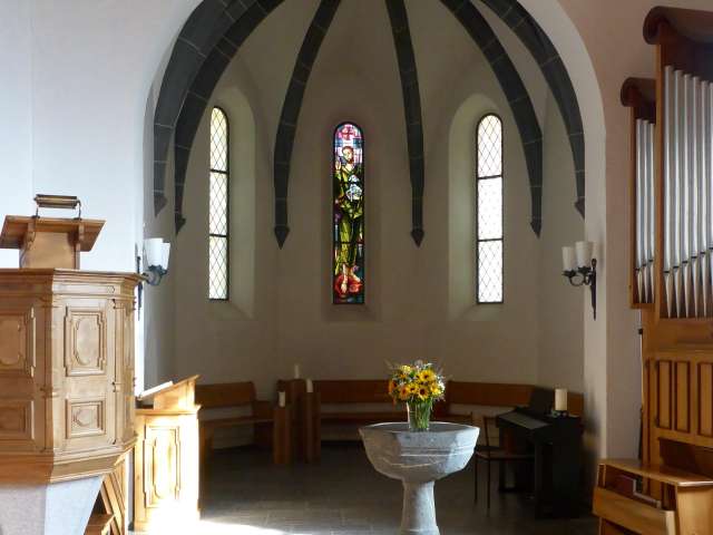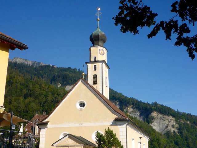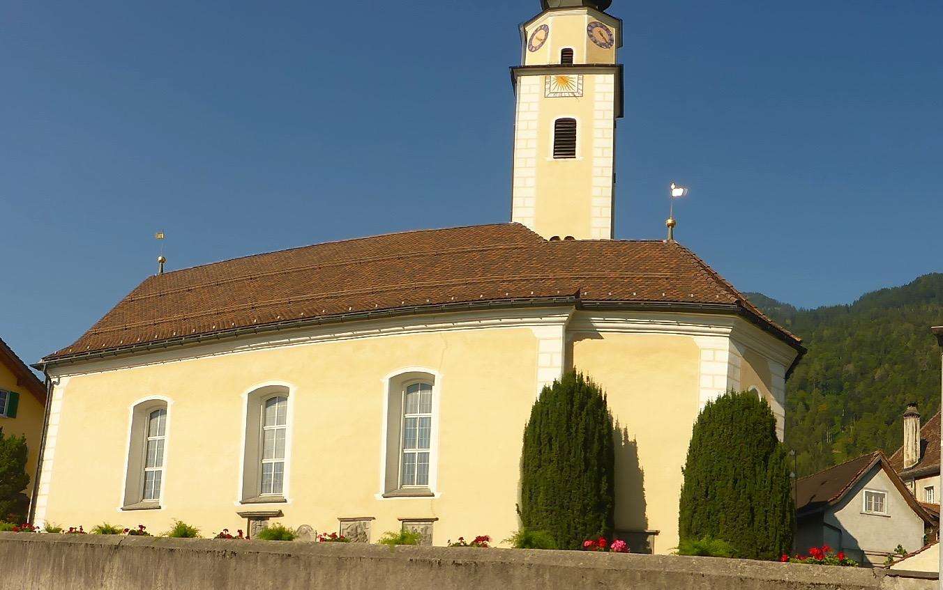 Zurückhaltender, aber prominent platzierter Bau, zwischen Rat- und Sprecherhaus. Der schlanke, Zwiebelhaupt gekrönte Barock-Turm dominiert das nach einem Dorfbrand 1745 erbaute Kirchenschiff. Gemalte Eckquader und Farbgebung erinnern an das weiter östlich liegende Pfarrhaus, das Salishaus. Bemerkenswerte Grabsteine aus dem 17.-19. Jh. zieren die Aussenwand und den Friedhof.