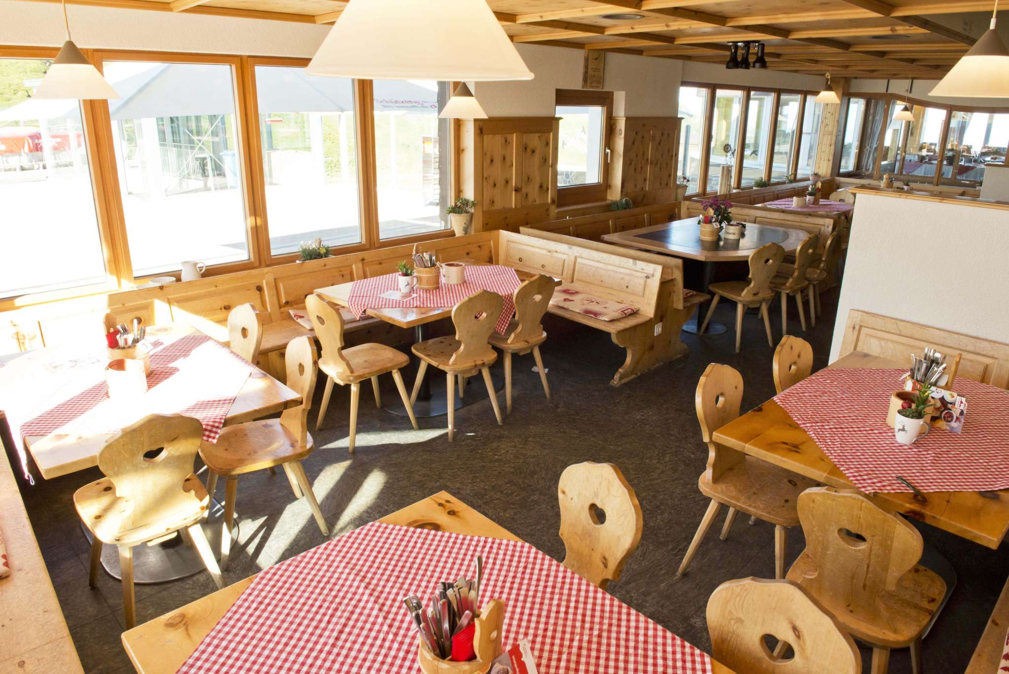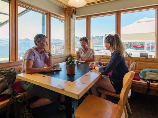 Im hellen Rundbau stehen Ihnen 80 Sitzplätze zur Verfügung. Im geräumigen Saal können 240 Gäste den Blick auf die Churfirsten geniessen und das gemütliche Stübli bietet 48 Plätze mit bester Sicht auf das Spitzmeilengebiet. Auf der riesigen Sonnenterrasse können 600 Gäste gleichzeitig das atemberaubende Panorama bestaunen (200 Sitzplätze). Zudem stehen Liegestühle zur Verfügung.