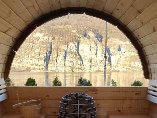 Entspannung pur im Saunafass des Hotel Schiffahrt Mols – mit Panoramablick auf die Berge, privater Nutzung & nordischem Flair.