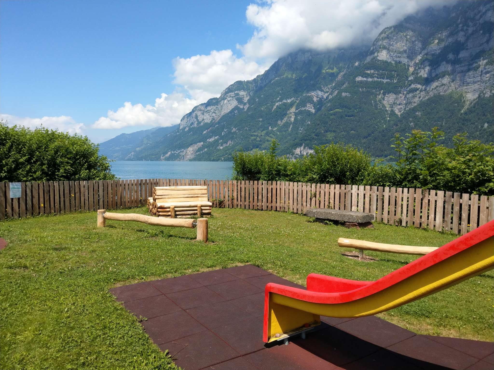 Zum Kapitän kannst du auf diesem Spielplatz gleich selber werden: am Steuerrad des kleinen Holzschiffes mit Balancierseilen, Rutsche und Wackelbrücke. Das kleine Karussell lässt die Welt ein bisschen schneller drehen, auf der Slackline erprobst du dein Gleichgewicht, durch Fernrohre erforschst du den Horizont und auf Baumstämmen sammelst du frische Kräfte. Die Rutschbahn führt die Kinder schnell vom Schiff herunter. Die Eltern können auf Holzbänken den Kindern beim Spielen zusehen oder den Ausblick auf den Walensee geniessen.