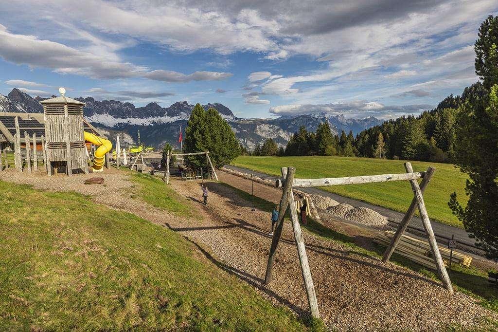 Der Spielplatz beim Restaurant Sennästube in Flumserberg Tannenboden bietet zahlreiche Aktivitäten für Kinder, darunter eine Zipline, ein Trampolin und eine Rundrutschbahn. Er liegt direkt neben der Restaurantterrasse und ist ideal für Familien.