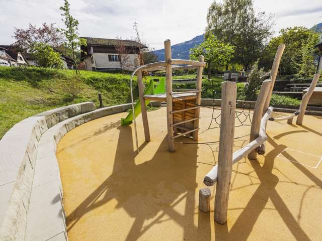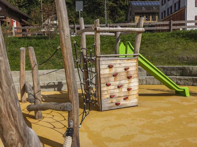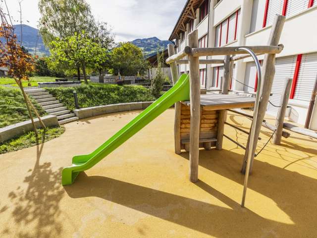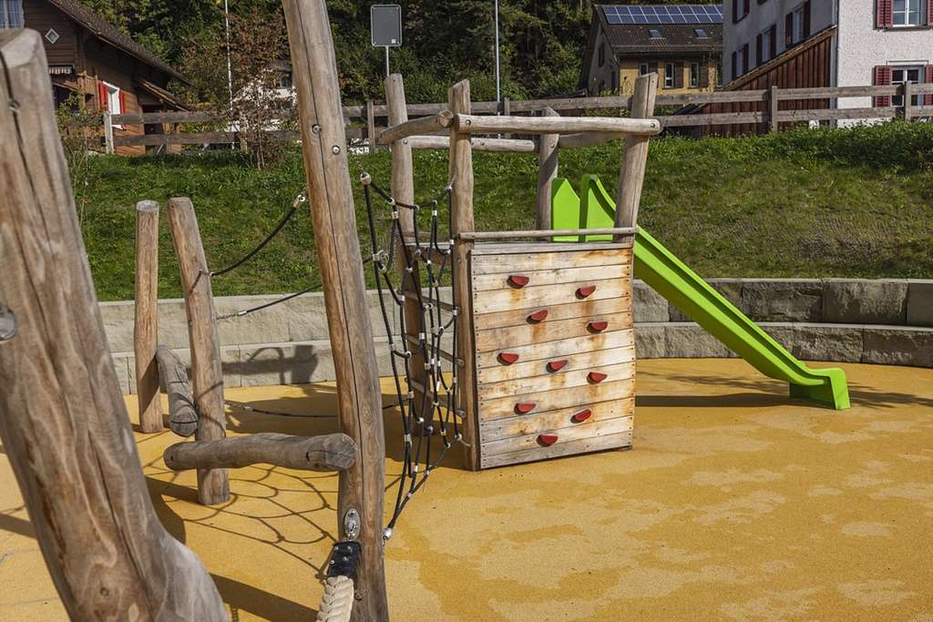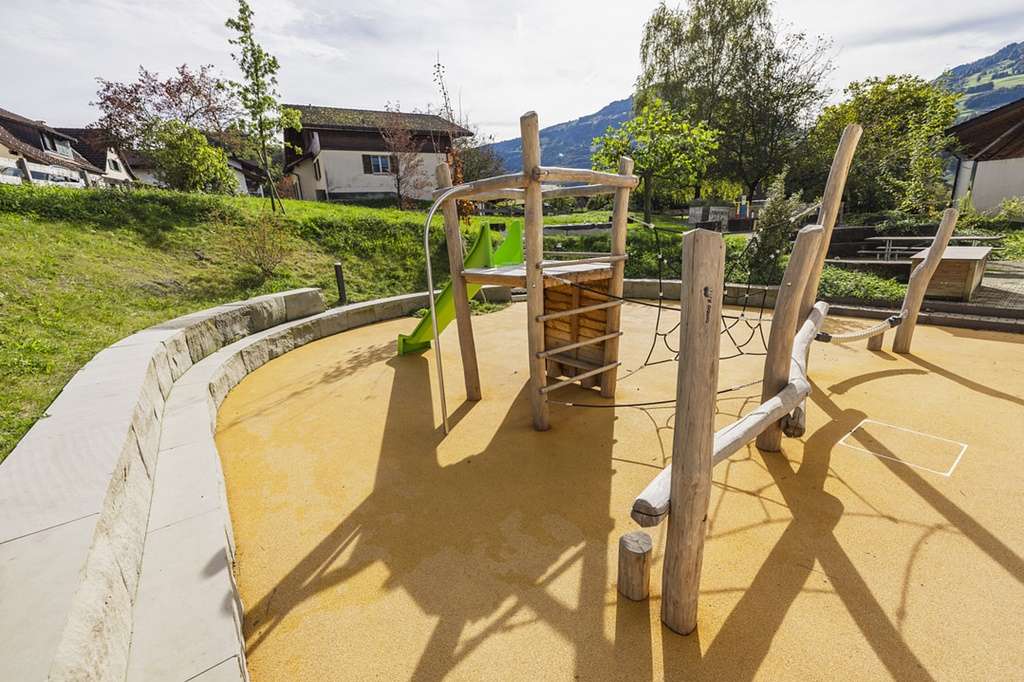 Der Spielplatz Camilu Schule Berschis bietet auf kleinem Raum Rutschbahn und Kletterelemente für jüngere Kinder. Ein idealer Ort für eine kurze, spassige Auszeit im Freien.