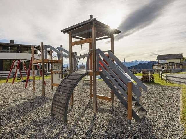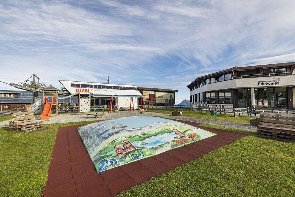 Der Spielplatz Pardiel Pizol in Bad Ragaz bietet eine Kleinkinderschaukel, einen Kletterturm und ein Hüpfkissen, ideal für die motorische Entwicklung und den Spielspass der Kleinsten.
