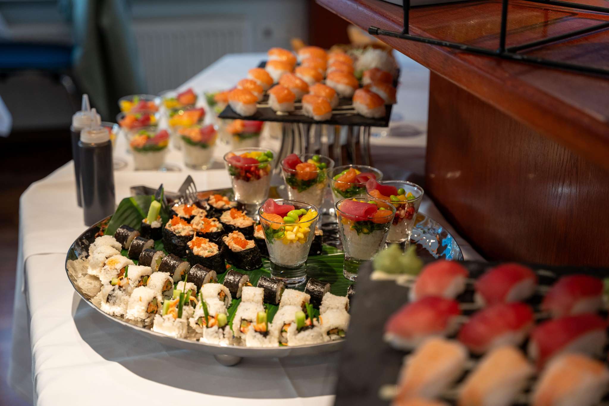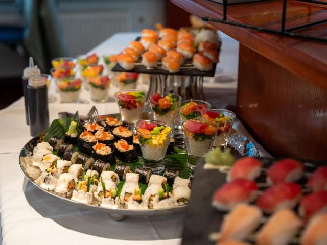 An Bord erwartet Sie eine exklusive Auswahl an frisch zubereitetem Sushi, begleitet von feinen Beilagen.