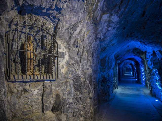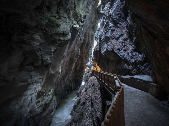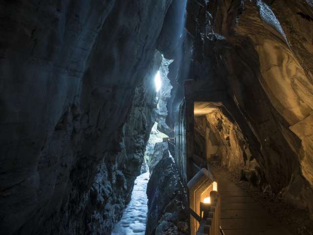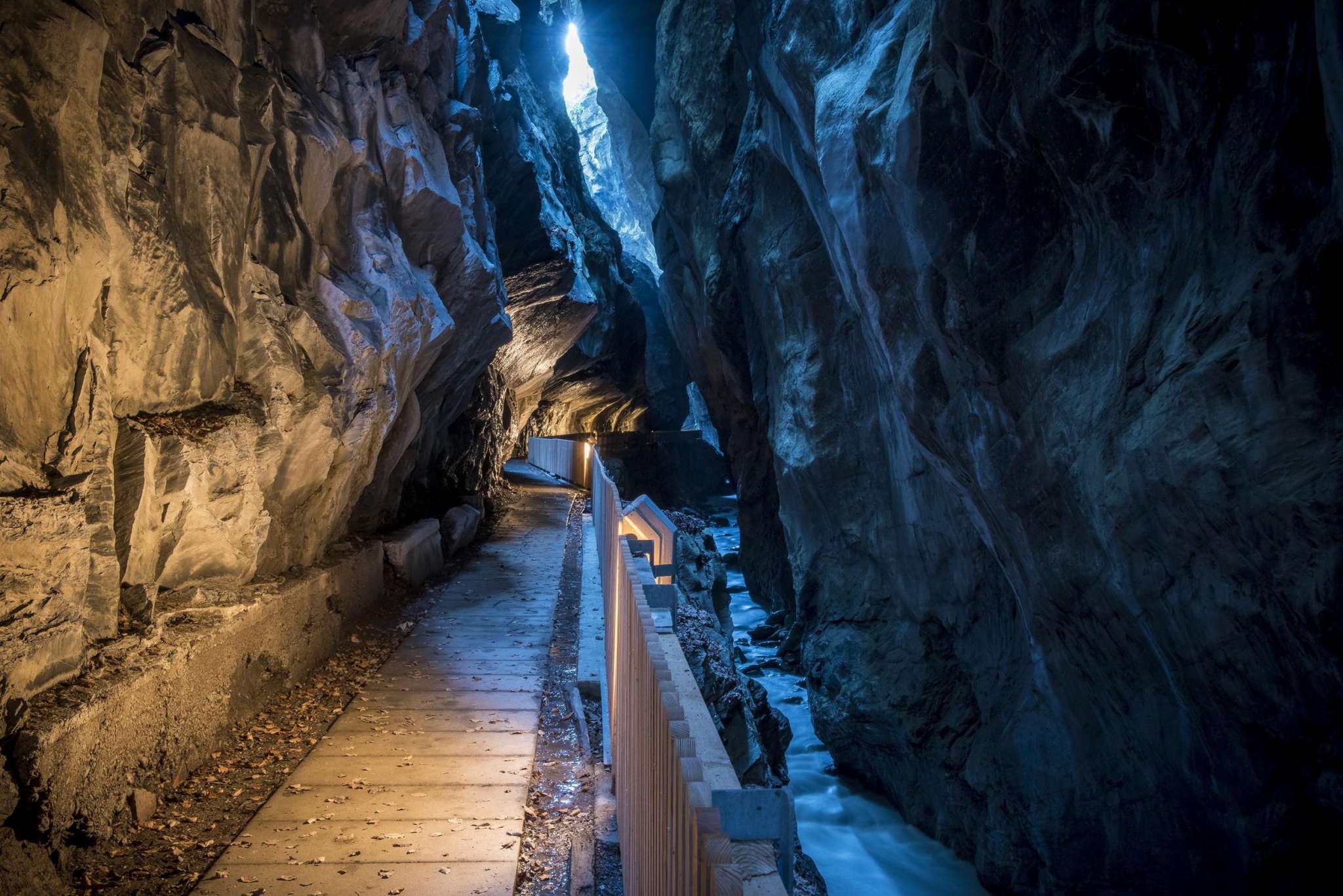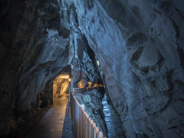 Die Taminaschlucht bei Bad Ragaz bietet einen 450 Meter langen, sicheren Weg zur Quellwasser-Grotte. Hier sprudeln 8000 Liter Thermalwasser pro Minute aus Europas ergiebigster Akratotherme mit einer konstanten Temperatur von 36,5 °C.