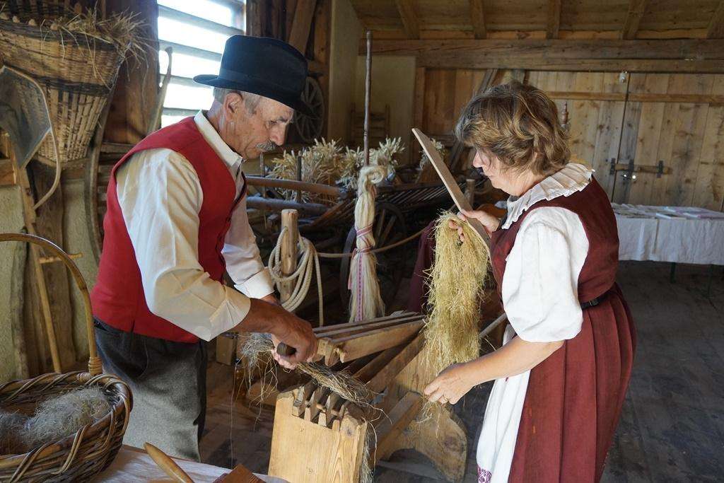 Riffeln, dreschen, rösten, brechen, hecheln, spinnen, weben und nähen.