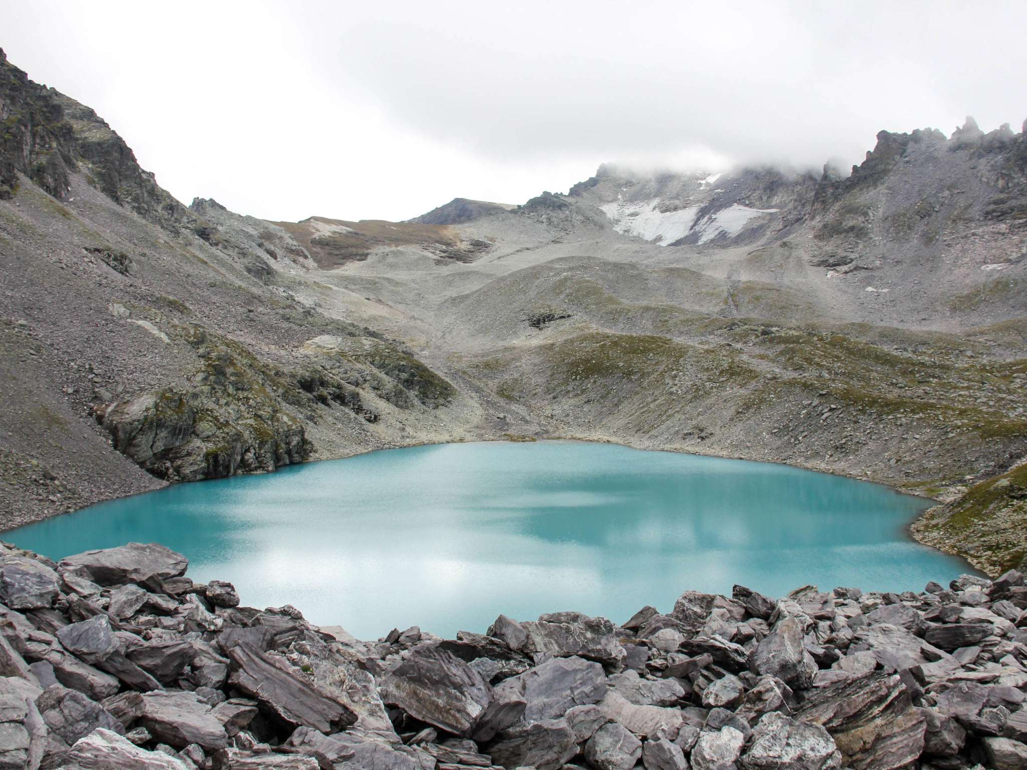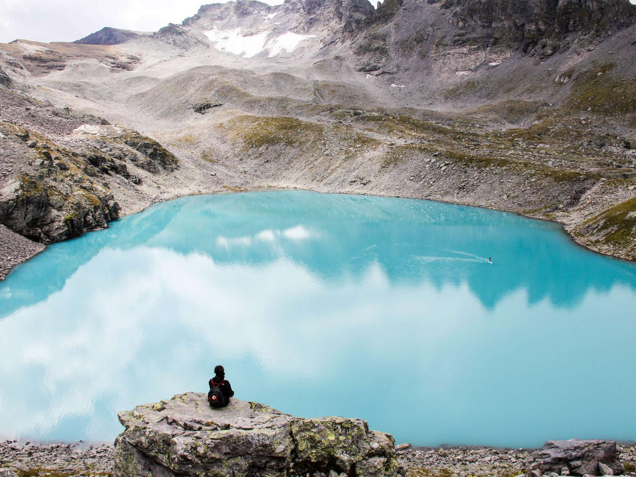 Der Wildsee, Teil der 5-Seen-Wanderung, liegt in einer hochalpinen Landschaft und beeindruckt mit seiner milchig-blauen Farbe. Die Wanderung bietet Ausblicke auf den Pizolgletscher und die Grauen Hörner.