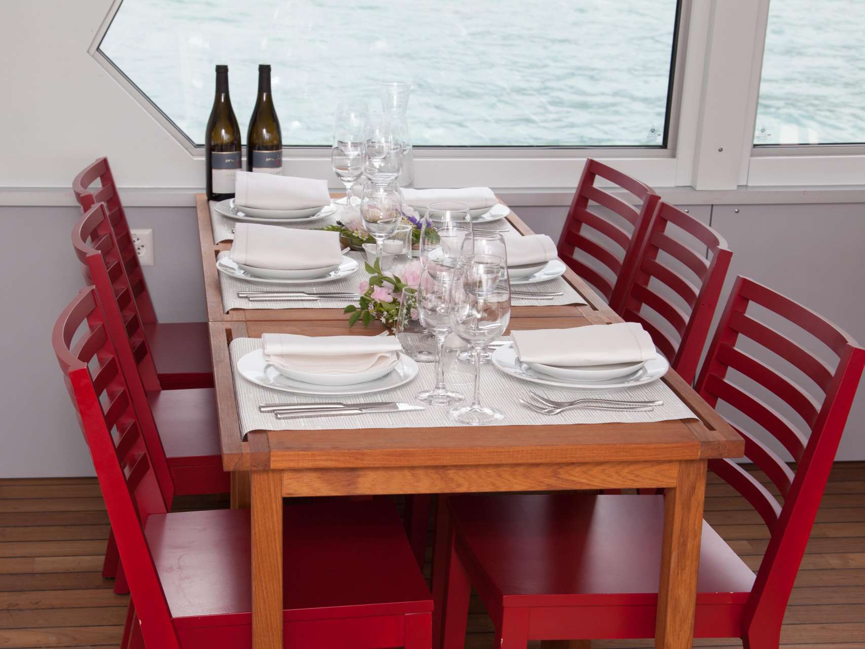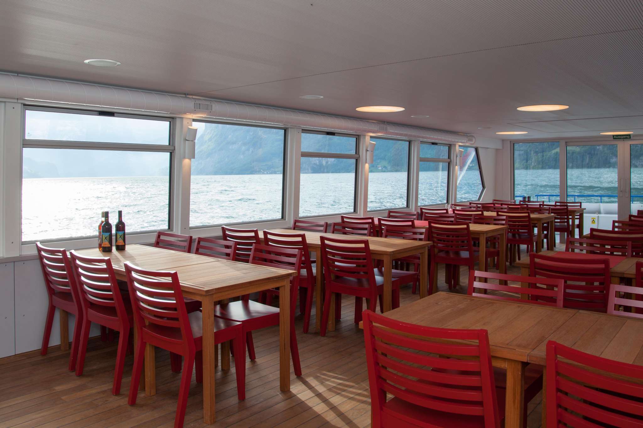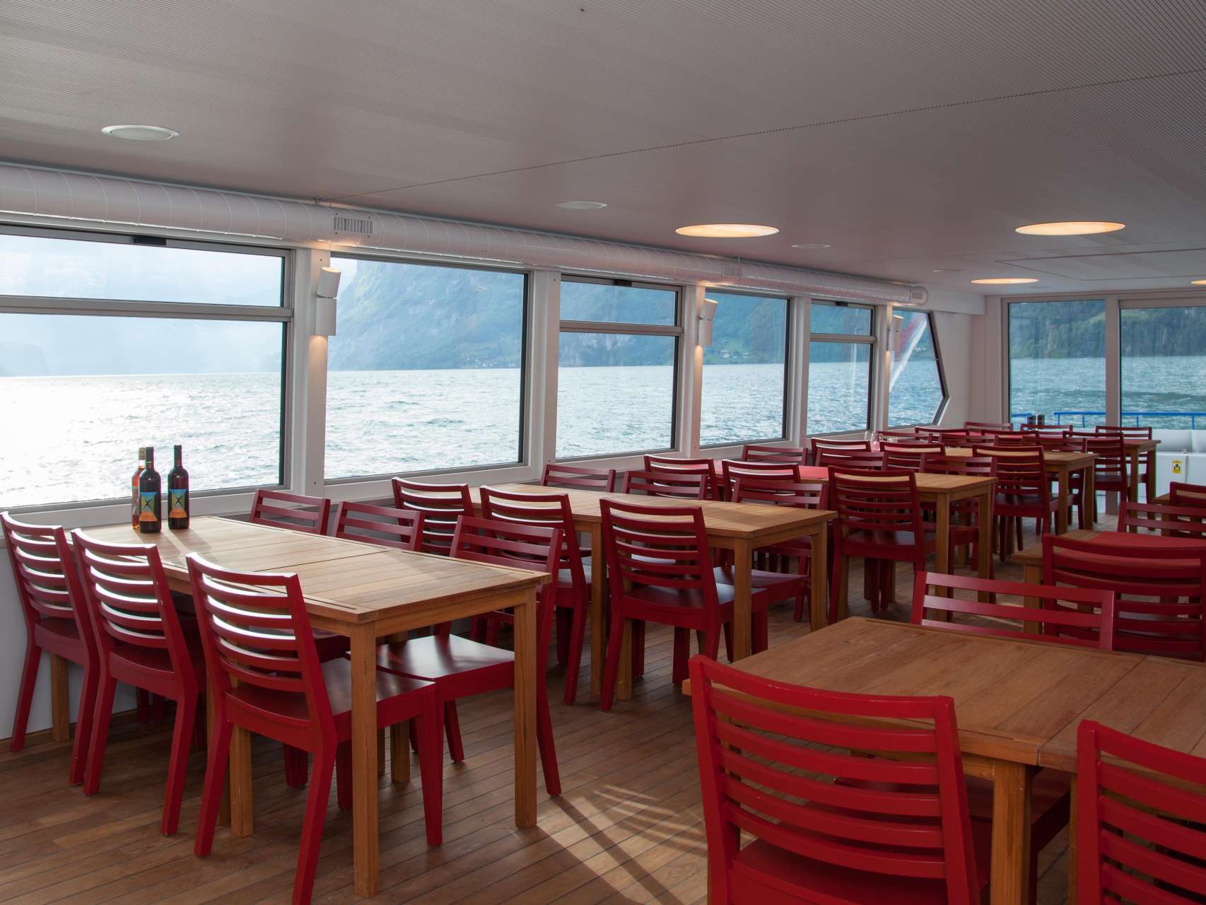 Das MS "Churfirsten", bietet viel Sicht auf den See. Moderne Tische und Stühle ermöglichen eine flexible und grosszügige Anordnung der Fahrgäste.